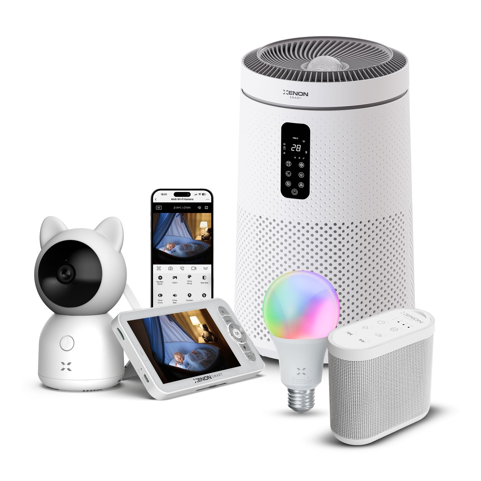Akıllı Bebek Kamerası Hava Temizleyici (Gece Lambalı) Beyaz Gürültü Pış Pış Sesi Uyku Arkadaşı ve RGB Ampul Seti