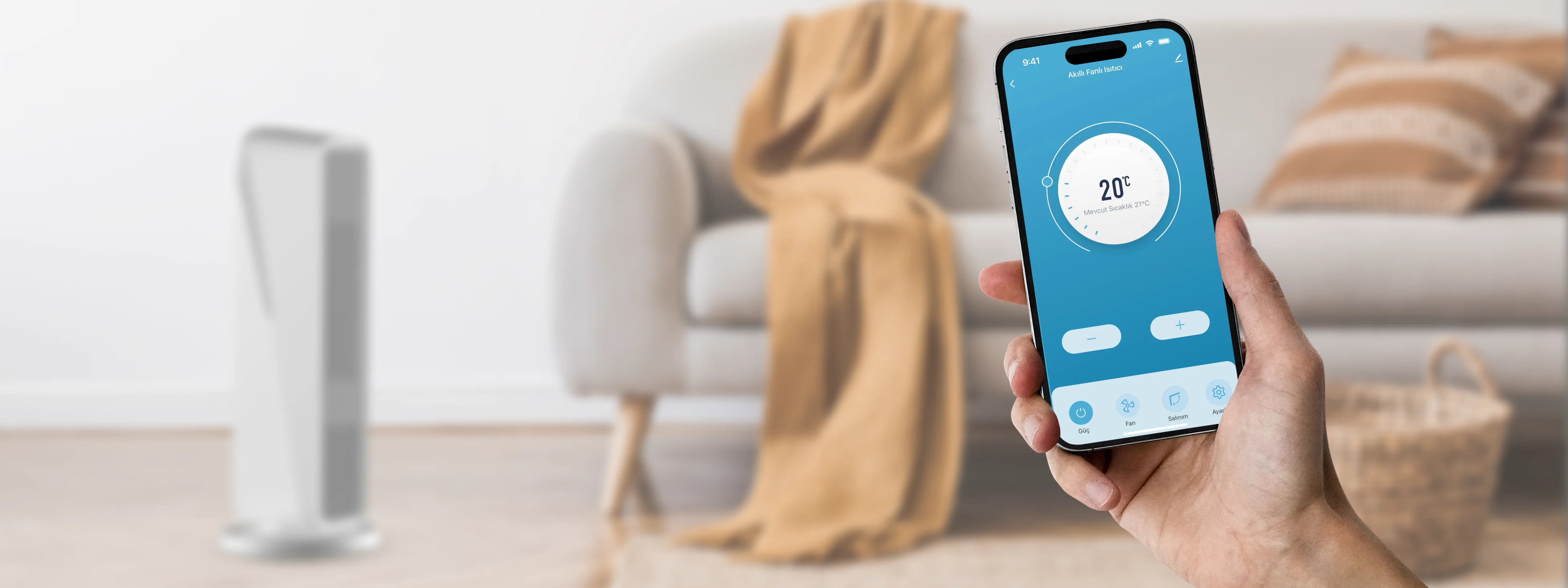 Akıllı Fanlı Isıtıcı’yı Wi-Fi 2.4 GHz bağlantısı sayesinde Amazon Alexa, Google Home ve Siri aracılığıyla kontrol edebilirsiniz.
