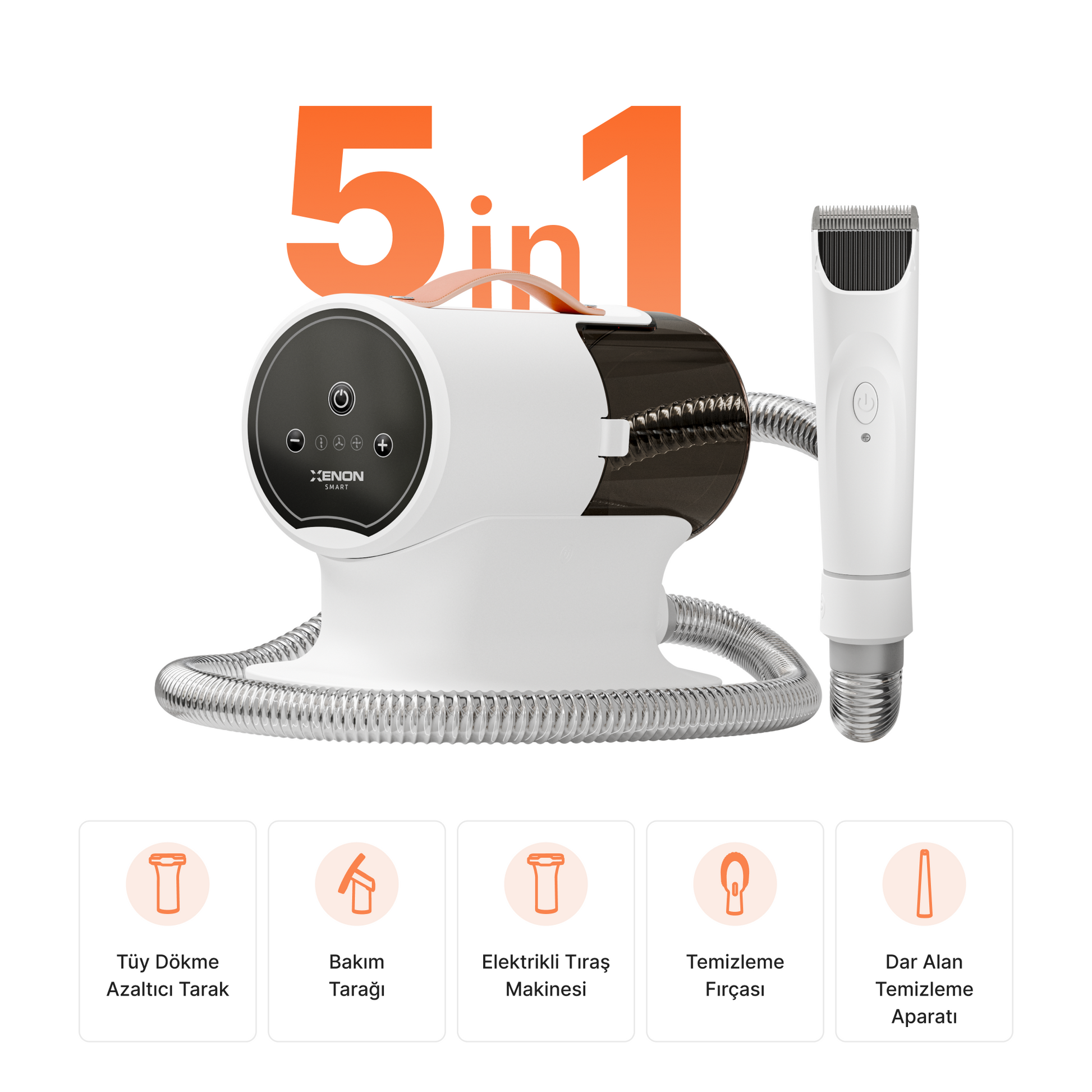 Xenon Smart Evcil Hayvan Bakım Seti; tüy dökme azaltıcı tarak, bakım tarağı, tüy uzunluğuna göre kesim yapmayı sağlayan 6 opsiyona sahip 3 farklı tarak seçeneği bulunan tıraş makinesi, temizleme fırçası ve dar alan temizleme aparatı ile patili dostunuzun tüm bakım ihtiyaçları karşılarken sağlıklı bir ortam yaratır. Evcil hayvanınızı tararken ya da tıraş ederken tüy ve kepekleri dökülmeden yakalayıp anında toz haznesine göndererek temiz bir ortam sunar.