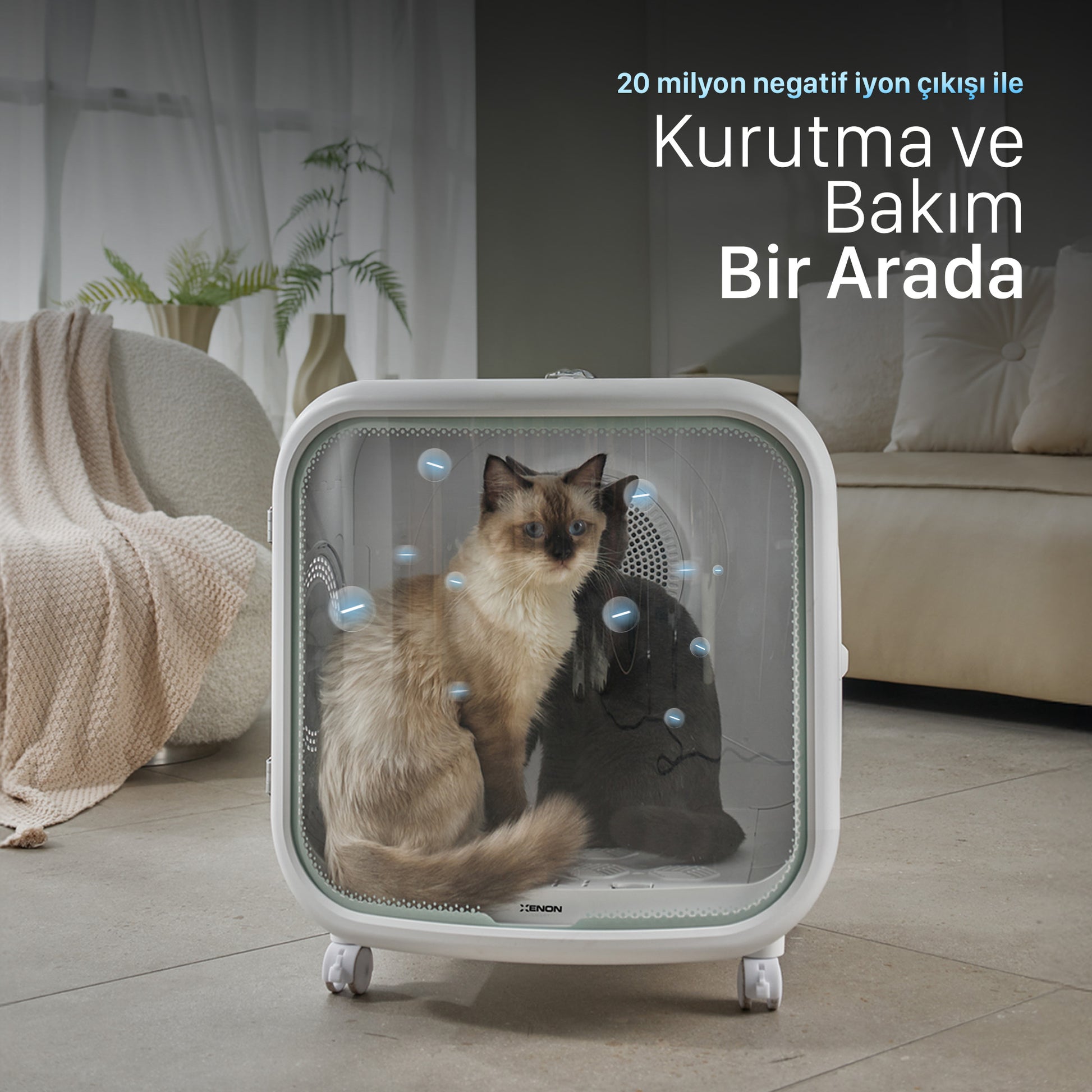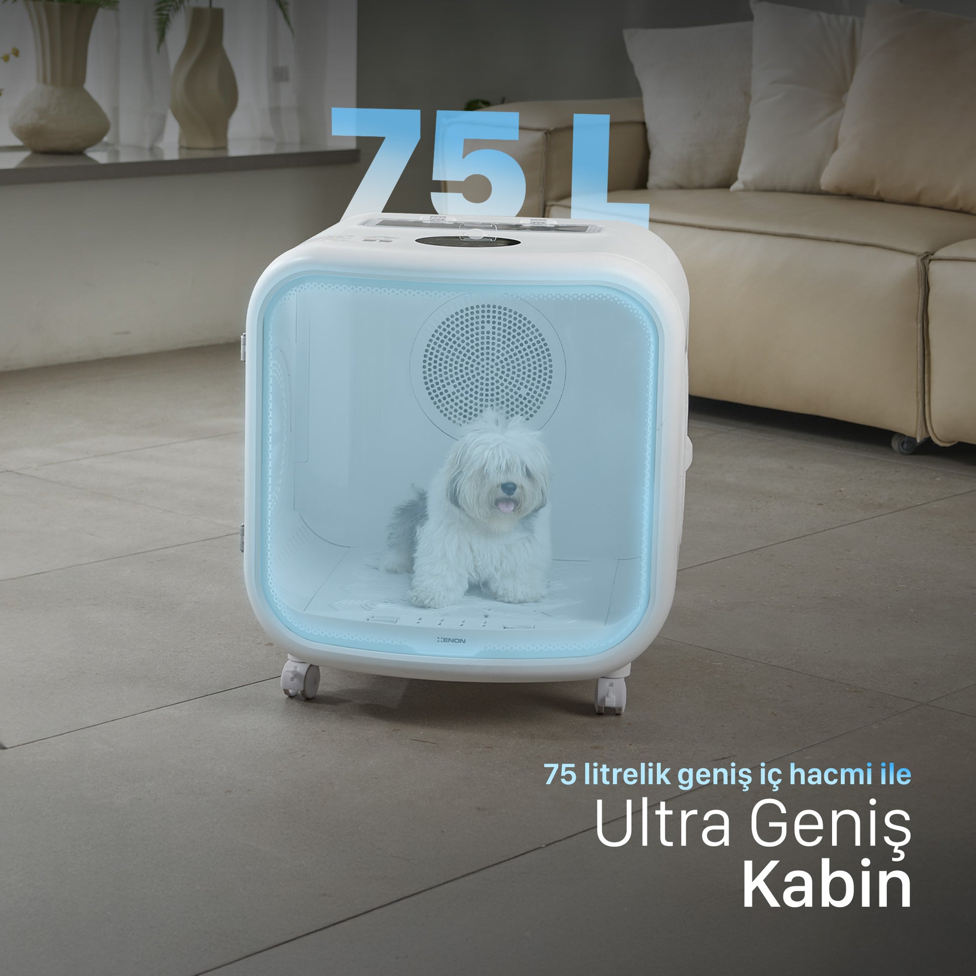 6 aylık ve üzeri kedi ya da küçük ırk köpekler için uygun olan Xenon Smart Evcil Hayvan Kurutma Makinesi, 75 litrelik geniş iç hacmi ile rahat bir kullanım sunar.